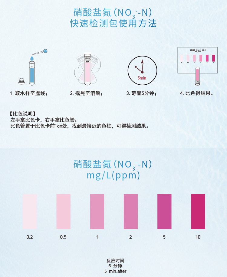2.本產(chǎn)品檢測水中硝酸鹽氮(NO3- -N)含量在0.2-10mg/L(ppm)范圍內(nèi),若要檢測5mg/L以上濃度水樣,請預(yù)先稀釋水樣后再進行測定,具體操作見稀釋說明書。