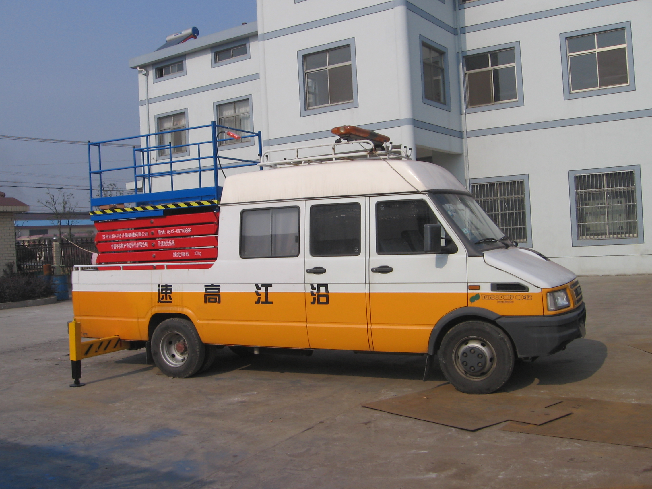 車載式高空作業臺是由升降臺與電瓶車或汽車配套改裝的高空作業設備。升降臺利用車輛的直流電或引擎動力驅動升降。